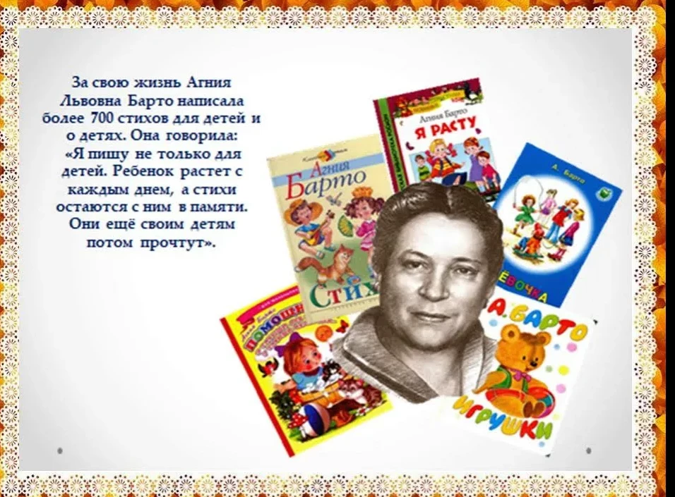 Агния Барто самая известная и любимая поэтесса детства. Дети любят ее произведения за то, что они очень легкие, понятные и запоминающиеся. Почти все ее стихи веселого и интересного содержания. В своих стихах она писала про детей, их поступках, описывала черты их характера.